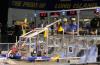 The robots from Team #1468 “Hicksville J-Birds” from Hicksville High School and Team #5736 “Kingsmen” from Kings Park High School attempt to score points by pulling themselves up during a match at the 13th Annual Kenneth R. Vessey Jr. Invitational.